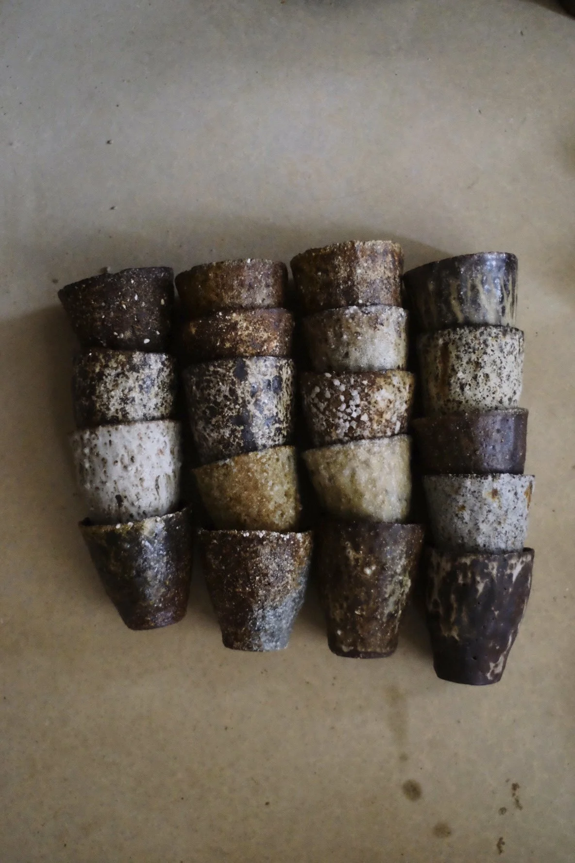 Quatre petites coupes en céramique de style ancien, posées sur une planche en bois, avec un fond en tissu beige. Les coupes ont des textures et couleurs variées, allant du blanc craquelé au noir émaillé.