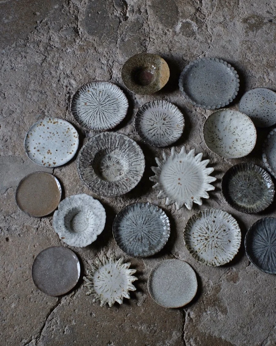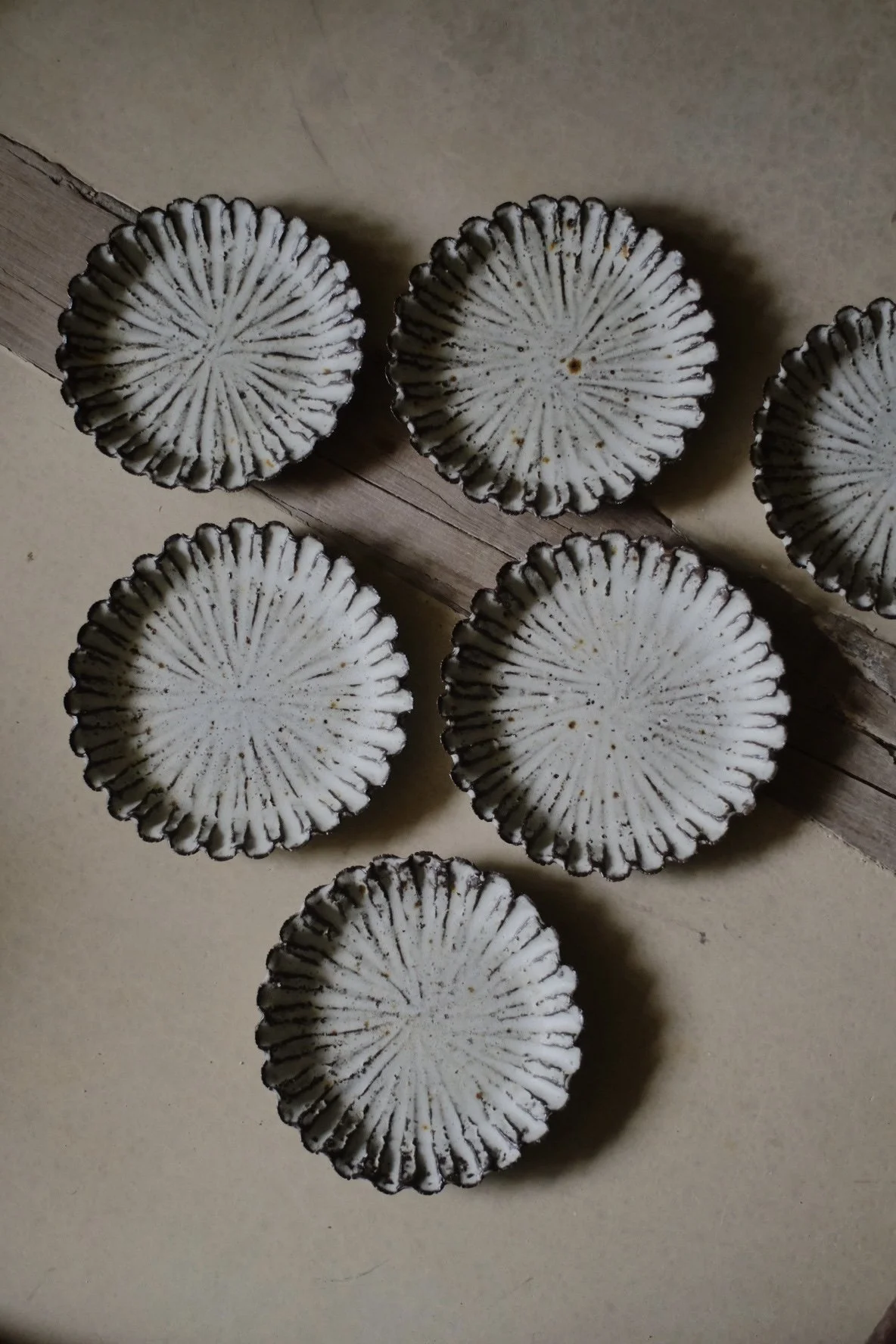 Ensemble de six petits plats en céramique blanche avec des motifs rayés, posés sur une surface en bois et en pierre.