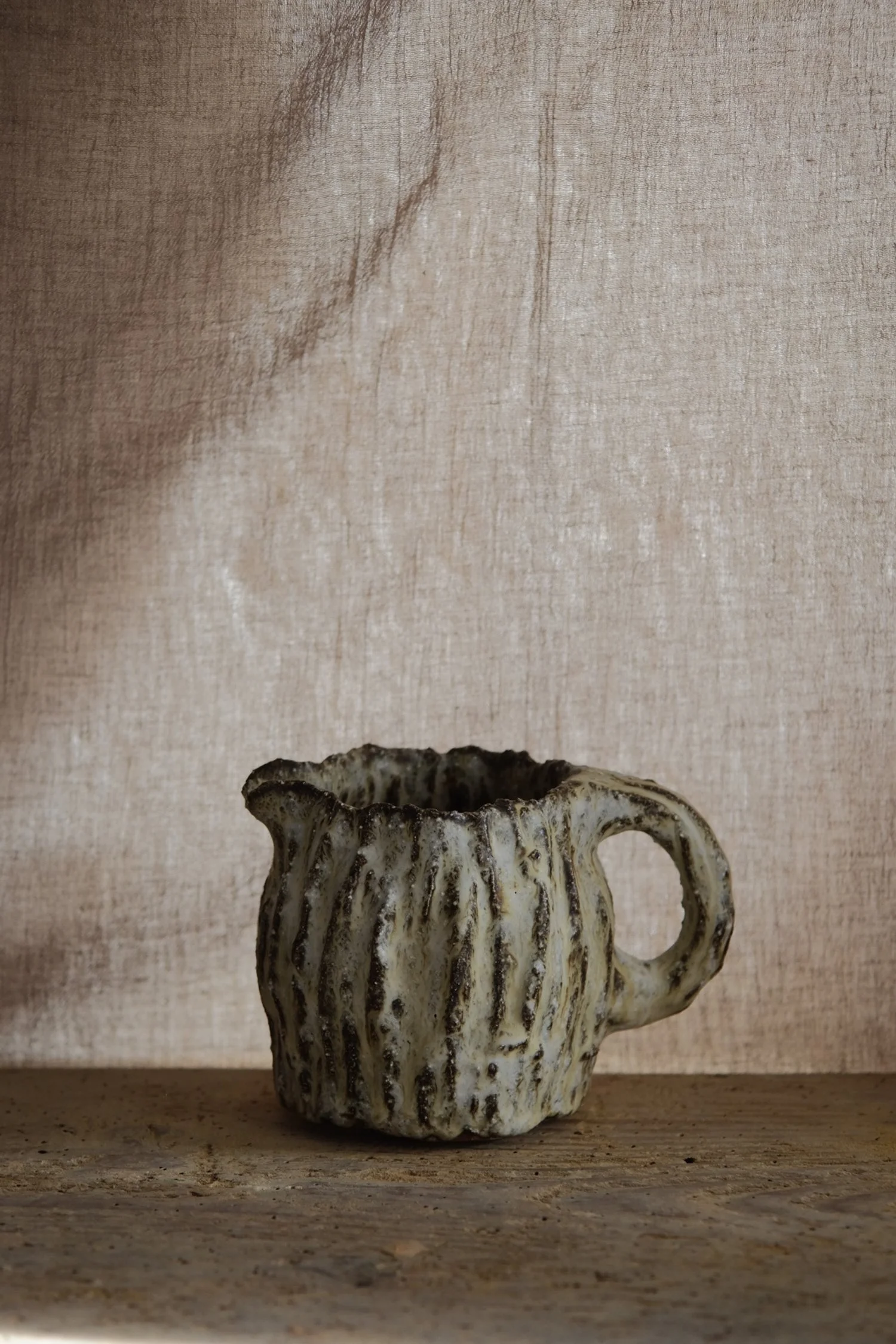 Une tasse en céramique à rayures noires et blanches posée sur une surface en bois avec un fond en tissu beige.